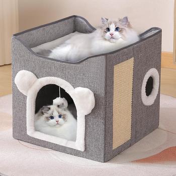 Interior Semi-fechado Cat Nest dupla Camada com Brinquedos Destacável e Lavável Folding Cat Villa Cat Scratch Board Tunnel Cave